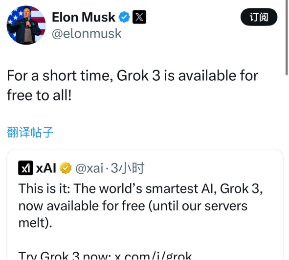 而马斯克也转发了这条消息:“短期内,Grok 3全面免费!”