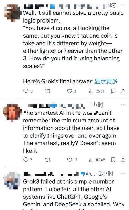 在xAI官方账号宣布Grok3免费的消息下,有很多评论都在表达对Grok3的失望,甚至是排着队接连出现,诉说自己提了多么简单的请求,而Grok3又是怎样地没有成功应答。
