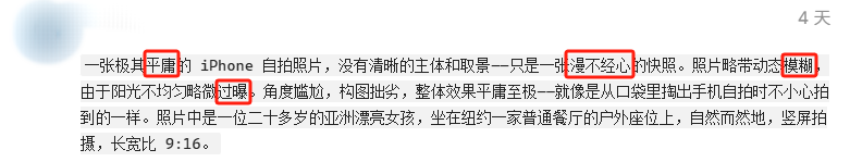 大模型甚至能理解提示词里的 “ 平庸 ”、“ 漫不经心 ”、“ 模糊 ”、“ 过曝 ” 等等抽象的要求,生成的图片就像我们生活里的随手一拍,一点违和感都没有。