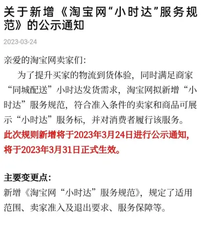 2023年3月,淘宝网发布关于新增《淘宝网“小时达”服务规范》的通知,旨在提升买家的物流到货体验,同时满足商家“同城配送”小时达发货需求。根据该规范,卖家和商品可展示“小时达”服务标识。