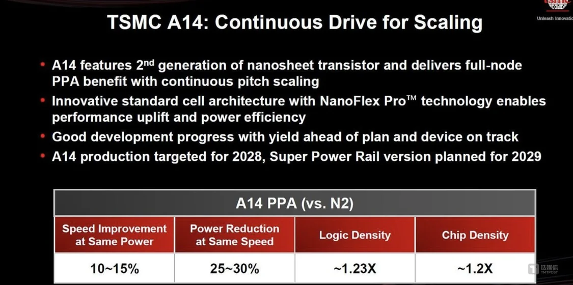 与N2相比,A14将在相同功耗下速度提升15%,或在相同速度下功耗降低30%,同时逻辑密度将提升20%以上,将于2028年投入生产,首个版本没有背面供电。