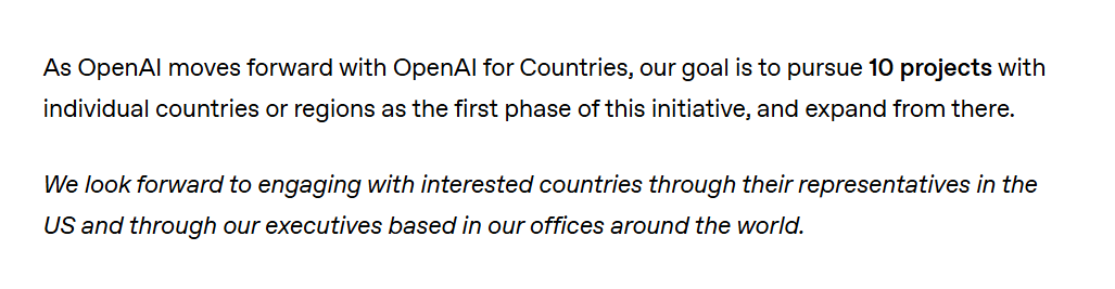 在OpenAI推进“OpenAI for Countries”这一计划时,我们的目标是在该计划的第一阶段与各个国家或地区开展10个项目,并在此基础上进一步拓展。