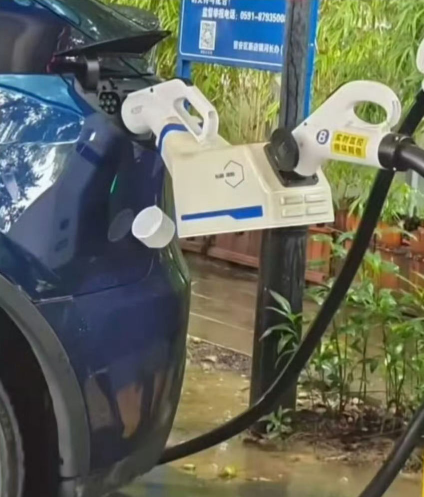 充电枪链接“壶尾”,“壶头”则插入到车辆的充电口里,像是桥梁一般链接,看起来颇为滑稽。