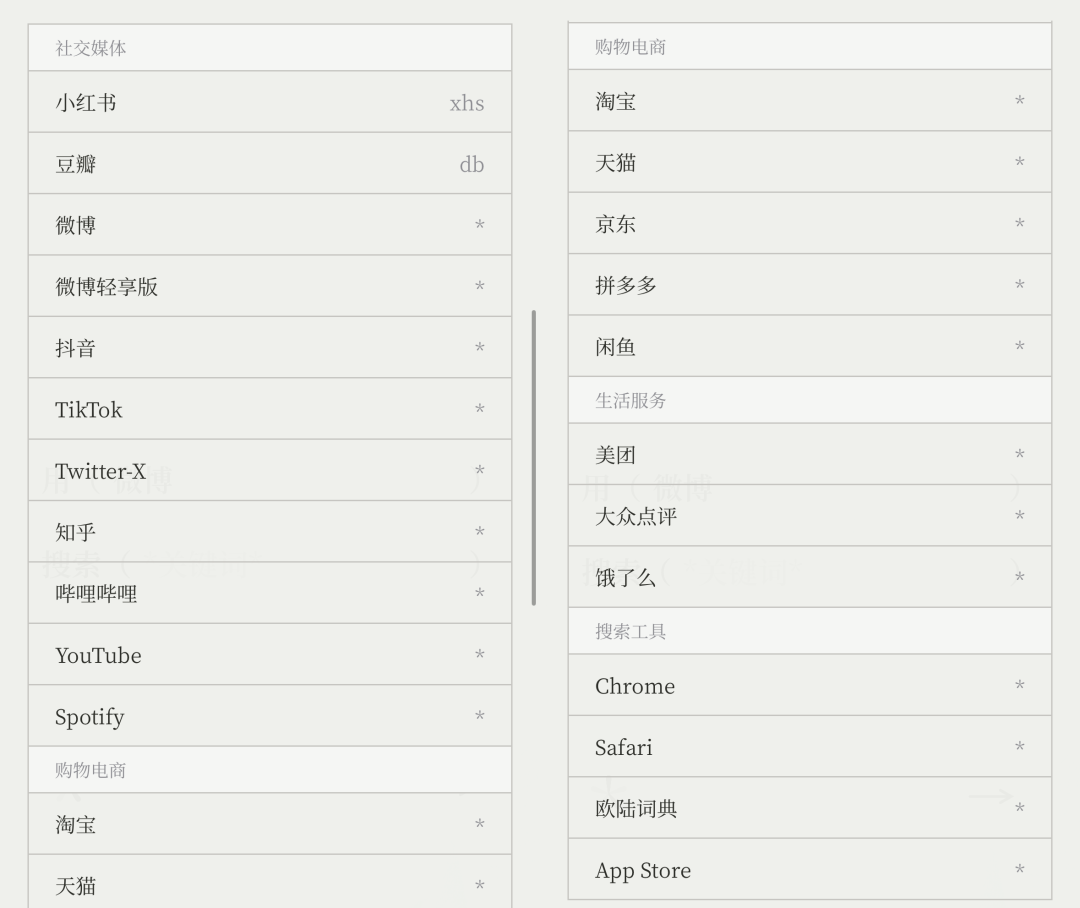 你可以按照自己喜好给 App 设定一个外号,比如小红书为“ xhs ”,淘宝为“ tb ”,豆瓣为“ db ”。