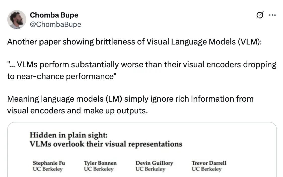 另一篇论文展示了视觉语言模型(VLM)的脆弱性:“视觉语言模型的表现明显比其视觉编码器差,性能会下降到接近偶然水平”,X用户Chomba Bupe认为,这意味着语言模型只是忽略了来自视觉编码器的丰富信息然后输出内容。