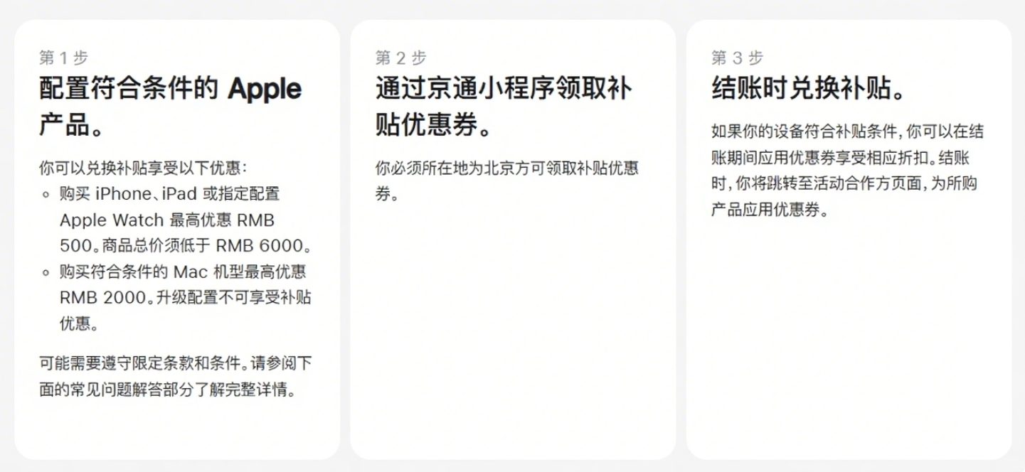 需要注意的是,当前仅支持北京/上海两个城市,其中北京收货地址可在线上官网享国补优惠(通过京通小程序领取补贴优惠券),上海可在线下零售店享国补优惠。