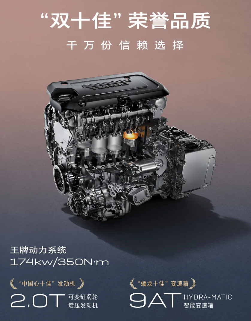 动力上,车辆配备2.0+48V轻混系统,车辆最大功率174kW,峰值扭矩350N·m,匹配9AT Hydra-Matic变速箱。