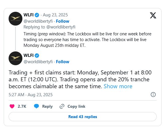 届时,早期以0.015美元和0.05美元购买该代币的投资者,可解锁其所持代币总量的20%,约占总供应量的5%。剩余80%将受社区治理约束,创始人、顾问和合作伙伴的分配仍处于锁定状态。WLFI代币预计将在币安、Coinbase和Hyperliquid等主流加密货币交易所上线。
