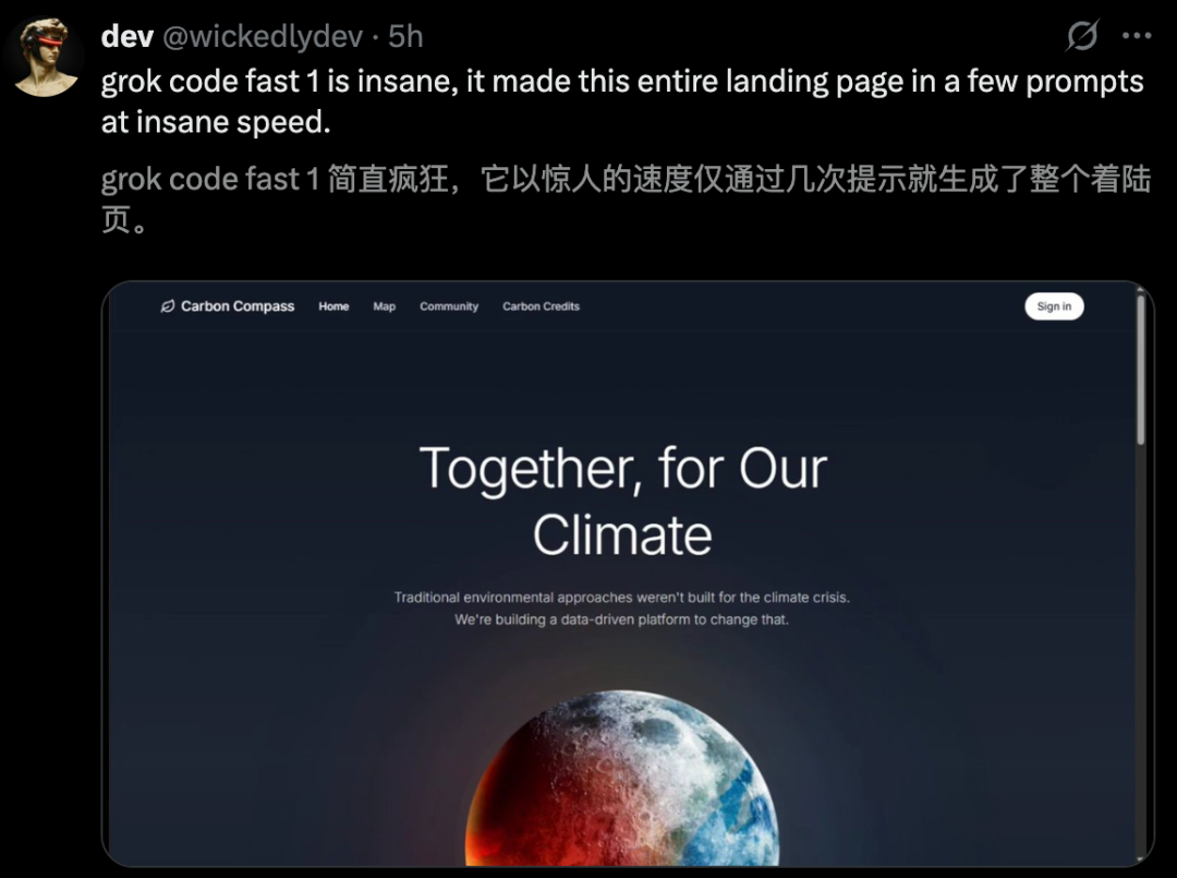 可以说,Grok Code编程实打实的强,有开发者测试,仅用几次提示直出一个网页。