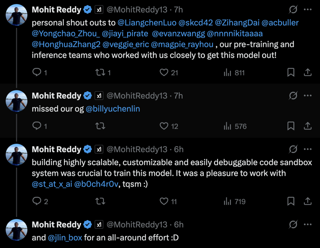 他特别点出了一些重点参与Grok Code的研究人员,其中华人学者占了半壁江山。
