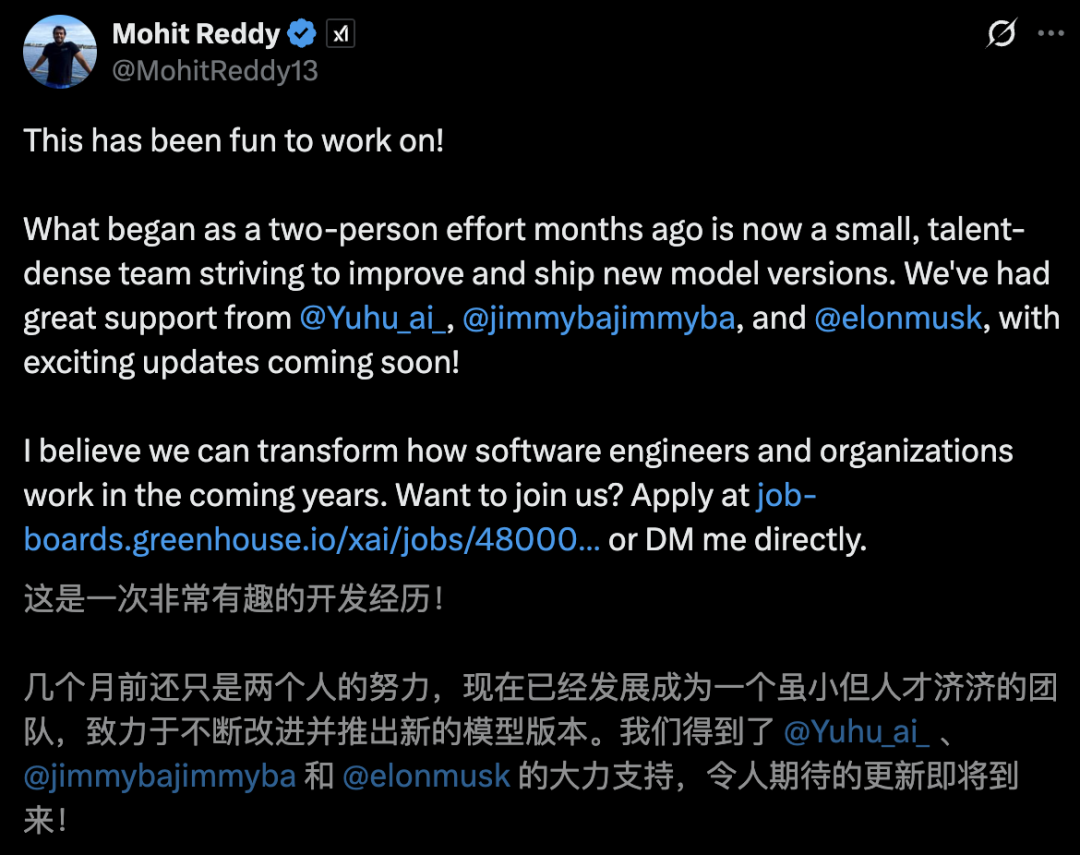 话又说回来,这次Grok Code能够顺利诞生,是xAI全团队的努力数月的结晶。