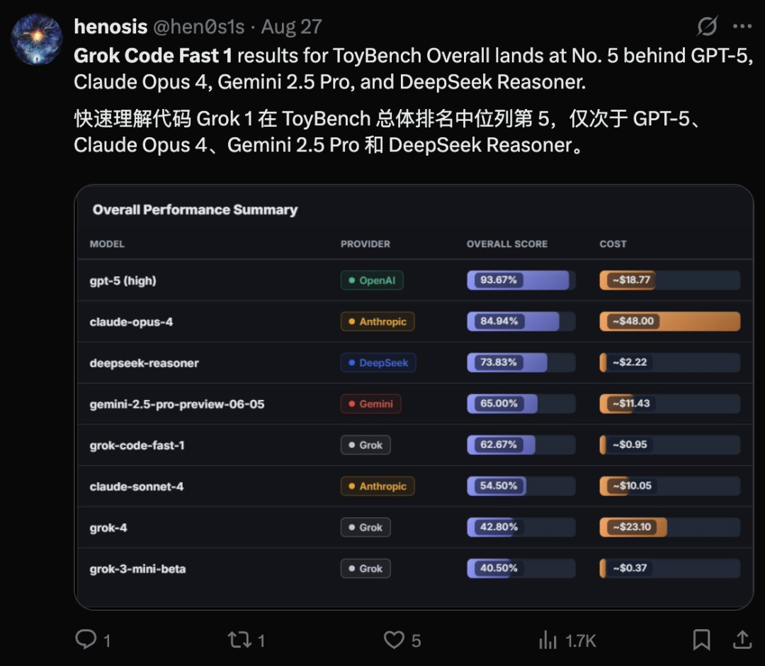 在ToyBench上,Grok Code位居第五,仅次于 GPT-5、Claude Opus 4、Gemini 2.5 Pro和DeepSeek Reasoner。