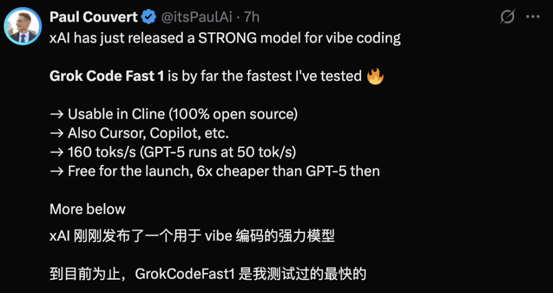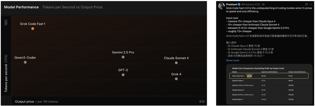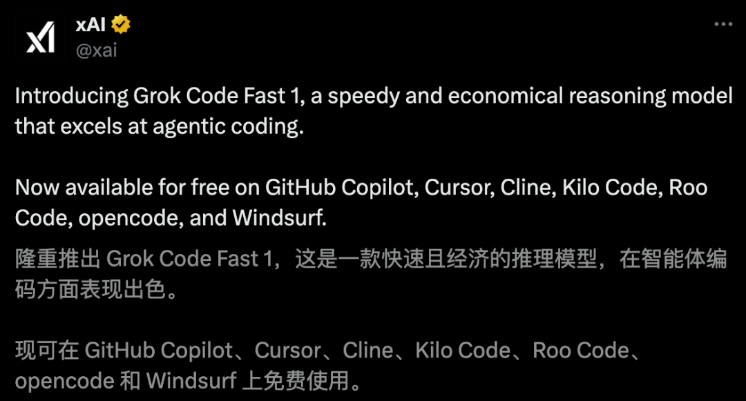 xAI从零打造的Grok Code Fast 1,专门面向更轻盈、更敏捷的编程场景,主打一个“快速响应”。