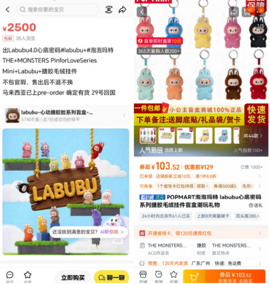 《BUG》栏目还发现,在闲鱼第三方平台上,一些倒卖“迷你Labubu”的商家或者黄牛,也在这一轮发售中尝到了甜头。在闲鱼第三方平台上,一组mini版LABUBU价格最高已经加价至2500元。此外,在淘宝上,一些非泡泡玛特官方商家也挂出了迷你版Labubu的链接,单个“迷你Labubu”售价较官方售价上浮30元到50元不等,销量最多的显示已经售出超1000单。