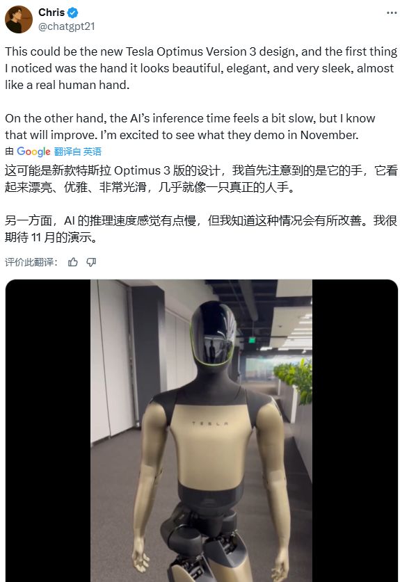 “这可能是Optimus 3的设计原型,这个手太漂亮了,简直就是人类的手。”网友同样惊叹,但他也指出,这个机器人AI的推理速度感觉有点慢。