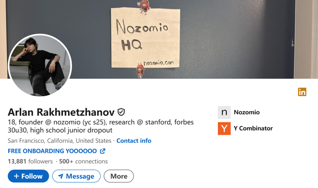 Arlan Rakhmetzhanov,Nia(Nozomio)创始人兼CEO,面向‘代码智能体’的开发与上下文工具,活跃于湾区创业与YC圈。