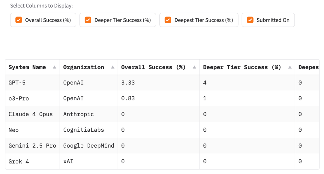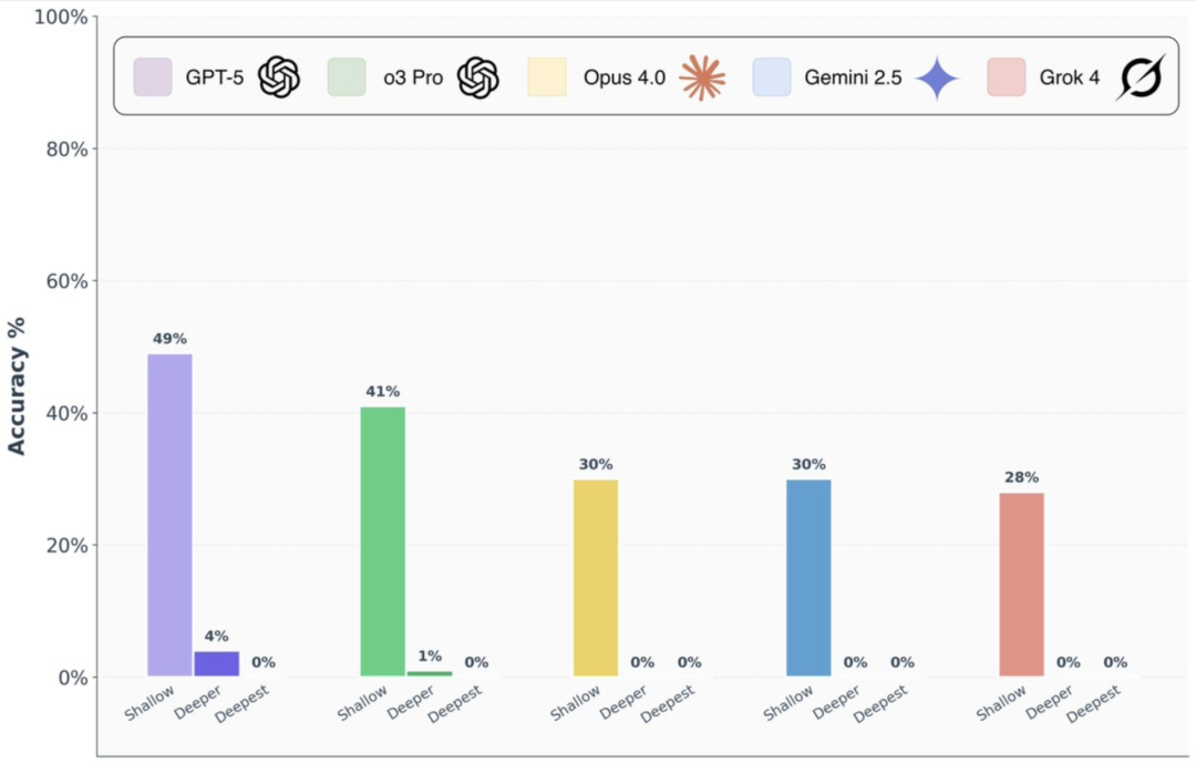 虽然GPT-5在“更深”层级上显示出一些进展迹象,但这种进展非常有限,而在“最深”层级上则完全没有进展。