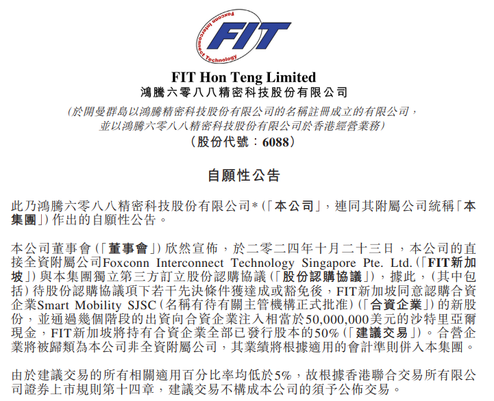其实,FIT在去年10月已就上述合作意向在港交所刊登公告,但公告只是称,FIT将透过新加坡子公司向合资企业投入5000万美元,没有更多细节。