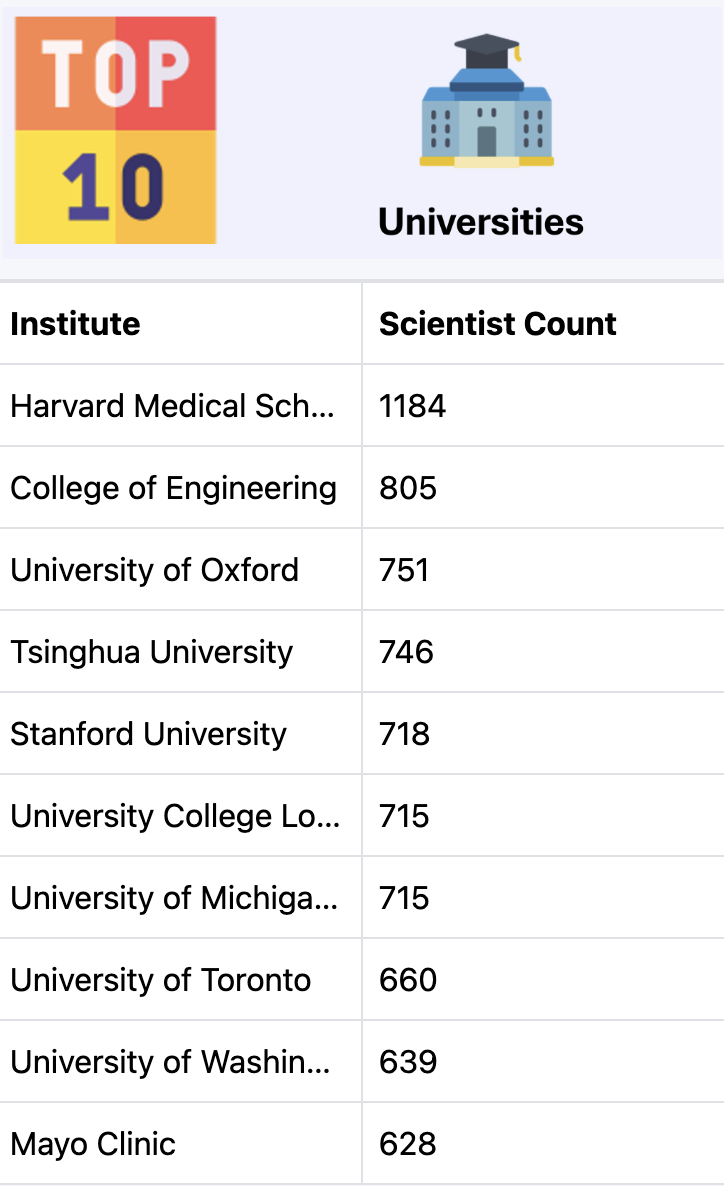清华大学入选年度Top10大学,共746位学者入选该榜单,稍落后于牛津大学,强过斯坦福大学,位居第四。