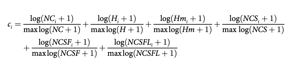 计算职业生涯整体影响力的复合指标公式,通过对6个指标(NC、H、Hm、NCS、NCSF、NCSFL)求和得出: