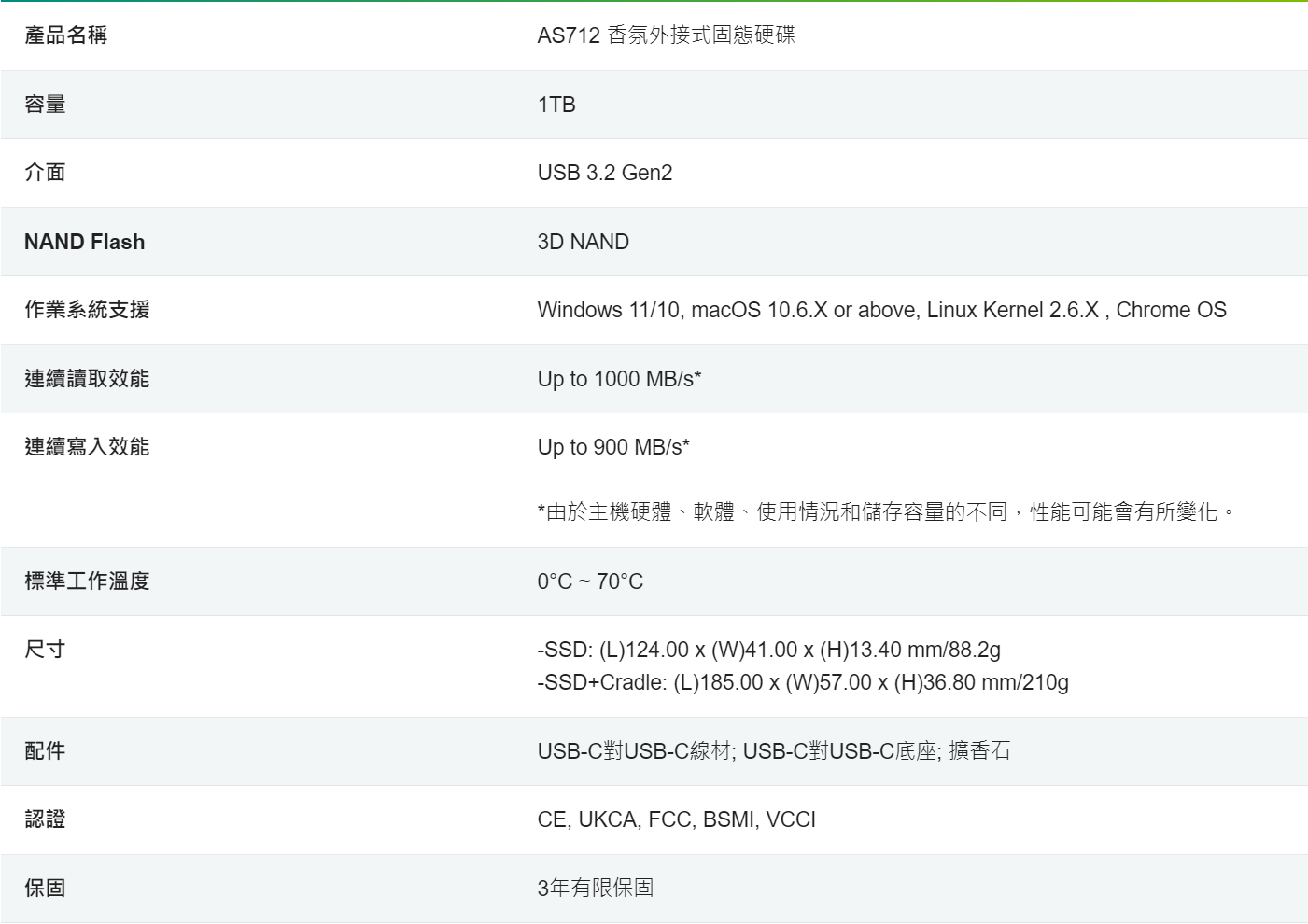 在性能方面,AS712配备了1TB的存储容量,支持1000MB/s的顺序读取速度和900MB/s的顺序写入速度,采用3D NAND闪存技术,通过USB 3.2 Gen 2 Type-C接口与设备连接。
