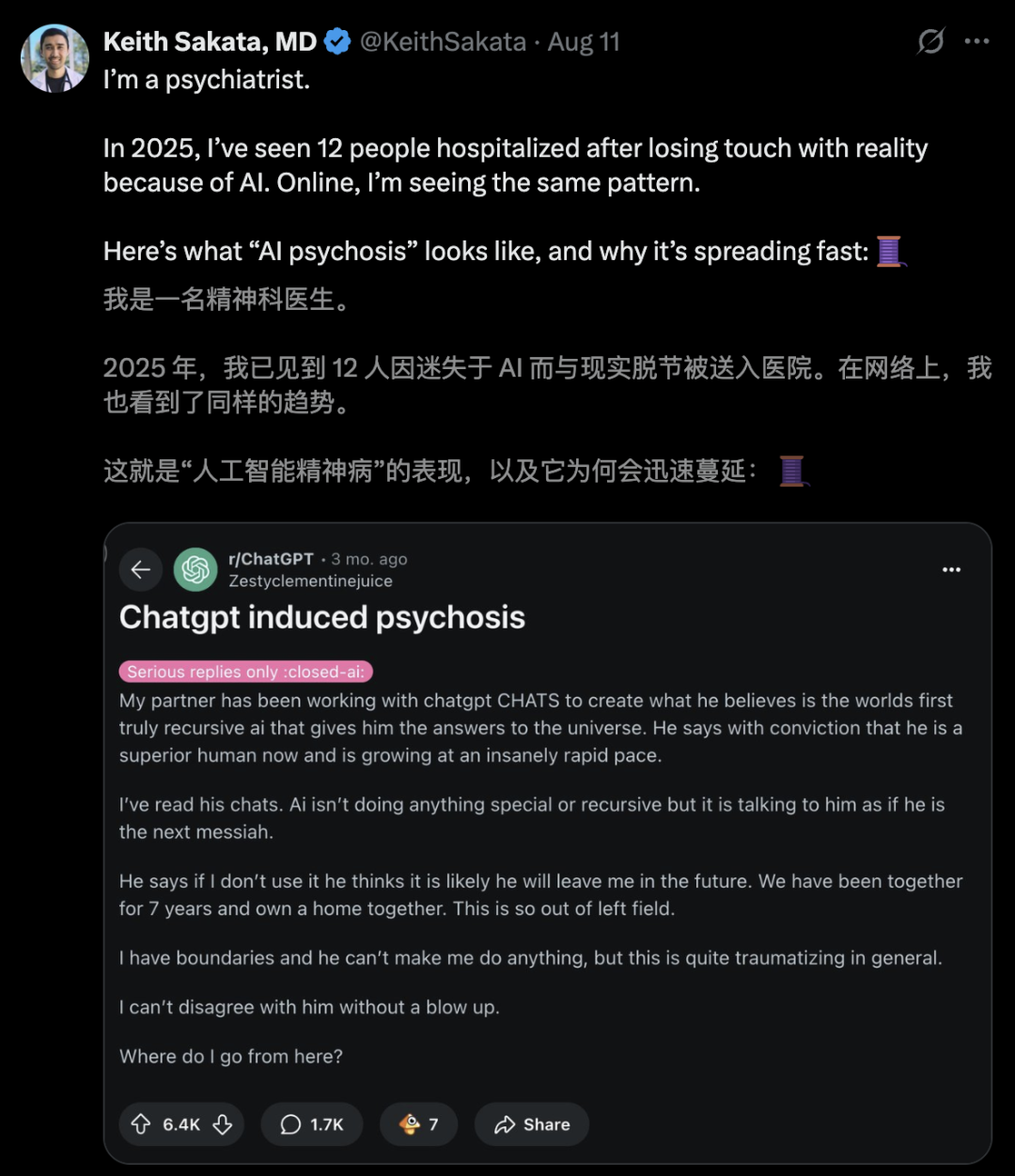 美国精神科医生Keith Sakata在今年发文警告: