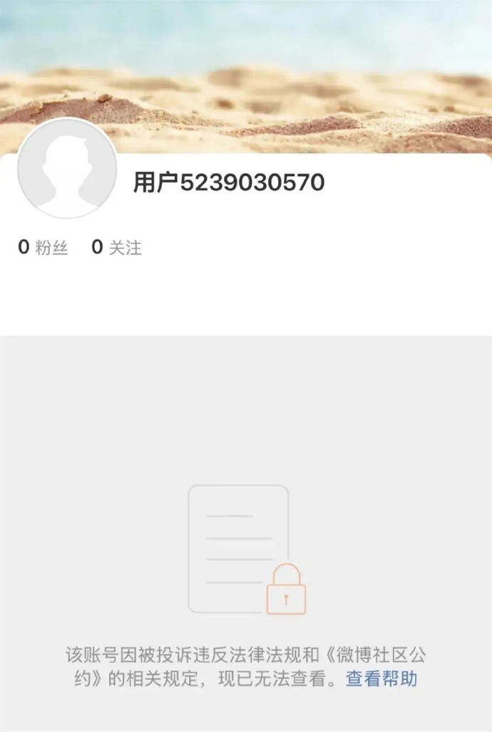 其微博账号页面显示:该账号因被投诉违反法律法规和《微博社区公约》的相关规定,现已无法查看。账号头像变灰,关注及粉丝数量清零。