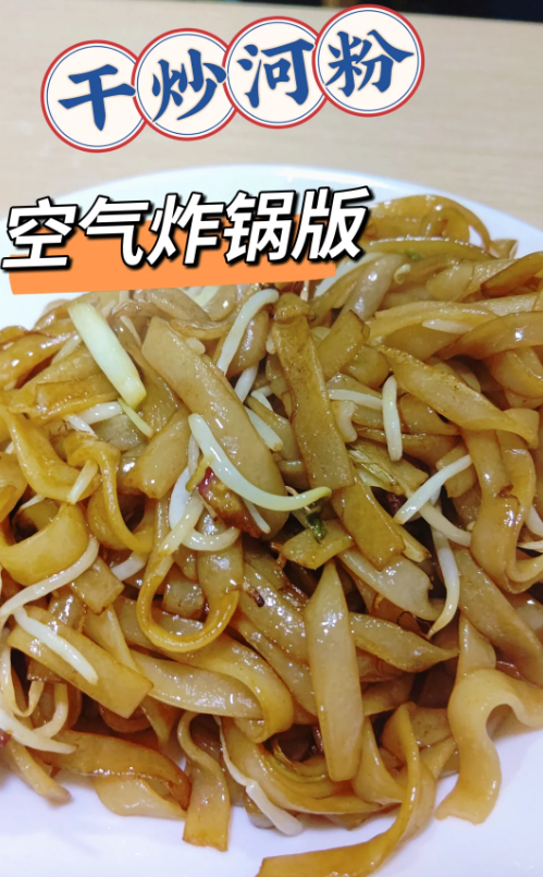 但看到用空气炸锅模拟干炒牛河的“镬气”时,我承认还是被此“邪修”大法闪了腰,这大概比较适合家里没有燃气灶和铁锅的懒人,总之将食材全都备好丢入空气炸锅,放入足量的油,出锅后的河粉有干香的气息,至少卖相还是相当不错的。