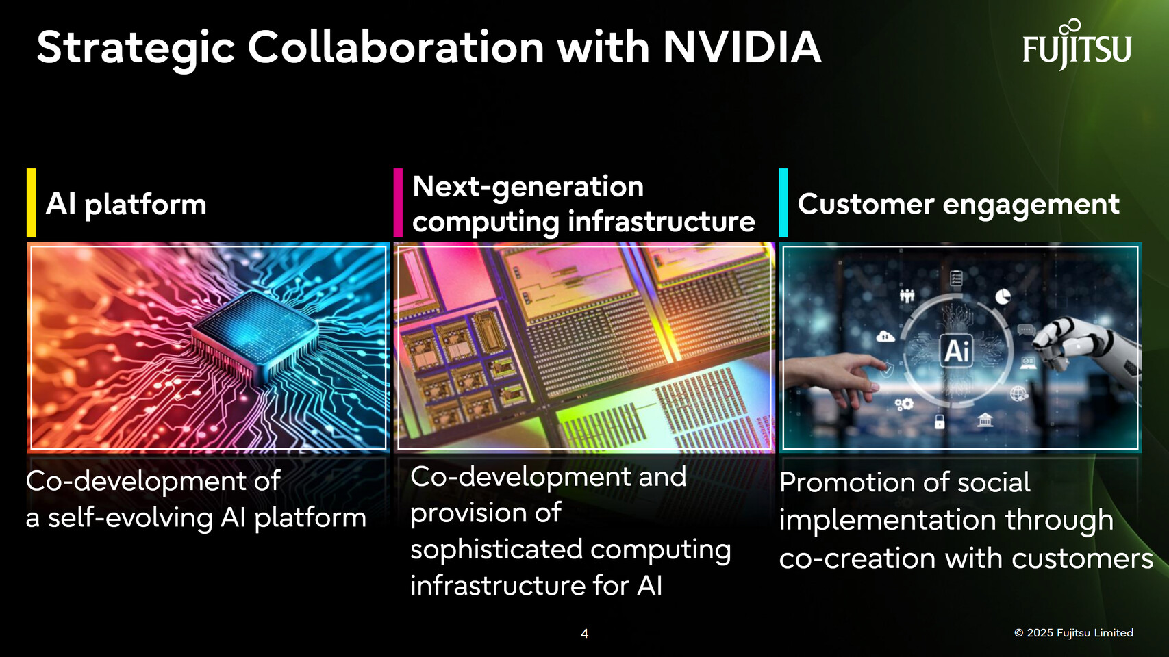 联合开发高效、先进的新一代计算基础设施,融合富士通MONAKA CPU与英伟达高性能GPU,通过NVIDIA NVLink-Fusion连接。