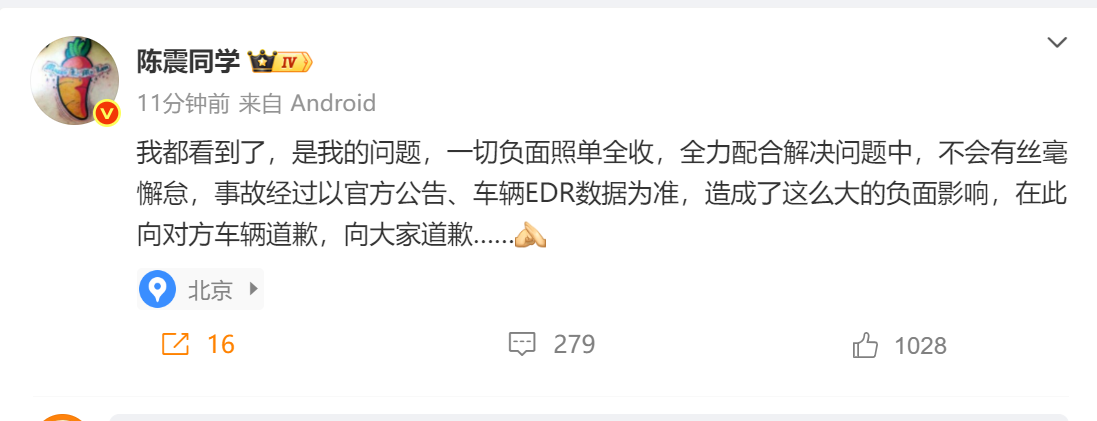 陈震在最新的回应中表示:“我都看到了,是我的问题,一切负面照单全收,全力配合解决问题中,不会有丝毫懈怠,事故经过以官方公告、车辆EDR数据为准,造成了这么大的负面影响,在此向对方车辆道歉,向大家道歉……”