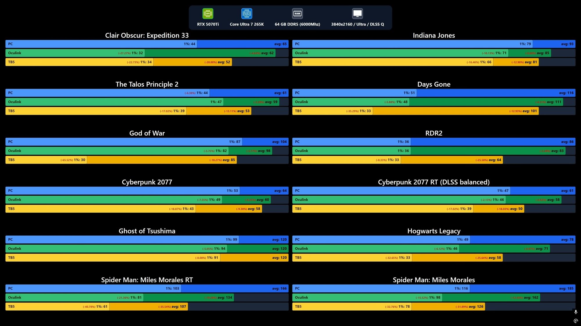外媒使用一款Peladn Link S-3外置显卡坞进行了测试,显卡采用RTX 5070 Ti,雷电5平台则由华硕ProArt Z890主板、酷睿Ultra 7 265K组成。