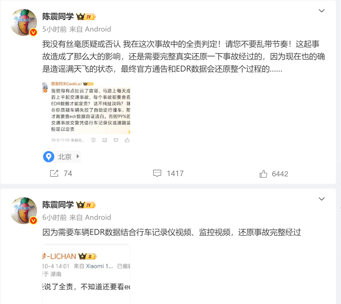 知名车评人陈震驾驶劳斯莱斯出事故受到了网友的围观,而从官方公告看,这件事他本人要负全责。对此,陈震多次回应,表示会对此事负责到底,其还在社交媒体上称:“我没有丝毫质疑或否认 我在这次事故中的全责判定!请您不要乱带节奏!这起事故造成了那么大的影响,还是需要完整真实还原一下事故经过的,因为现在也的确是造谣满天飞的状态,最终官方通告和EDR数据会还原整个过程的…… ”