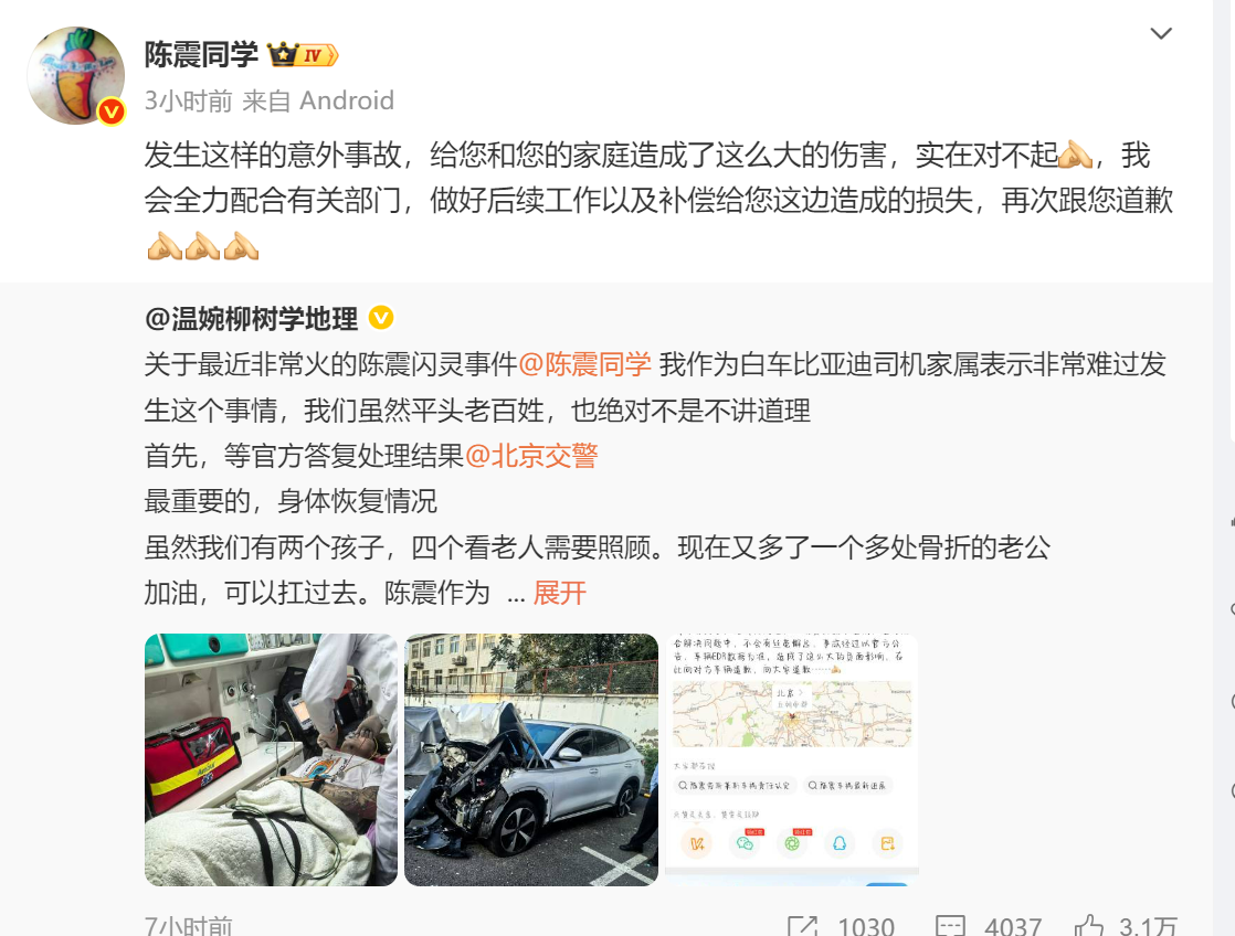陈震随后转发此条博文并道歉:“发生这样的意外事故,给您和您的家庭造成了这么大的伤害,实在对不起,我会全力配合有关部门,做好后续工作以及补偿给您这边造成的损失,再次跟您道歉。”