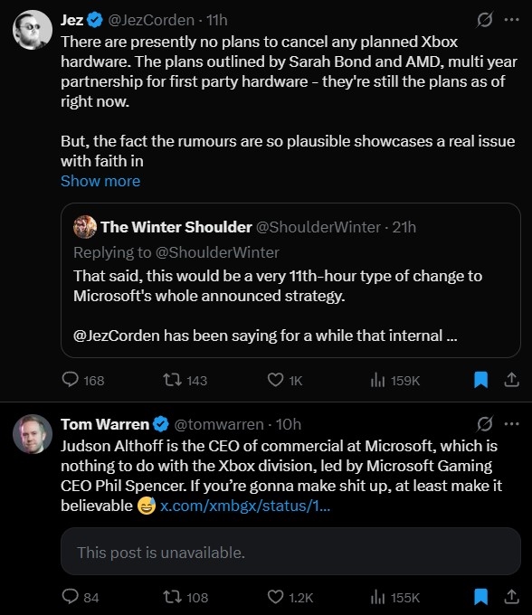 与微软关系密切的消息人士纷纷出来辟谣,除老牌软饭媒体WindowsCentral外,TheVerge的主编也澄清说,谣言中提到的Judson Althoff只是微软商务总裁,与Xbox有鸡毛关系,下次造谣想找垫背的请先找对人: