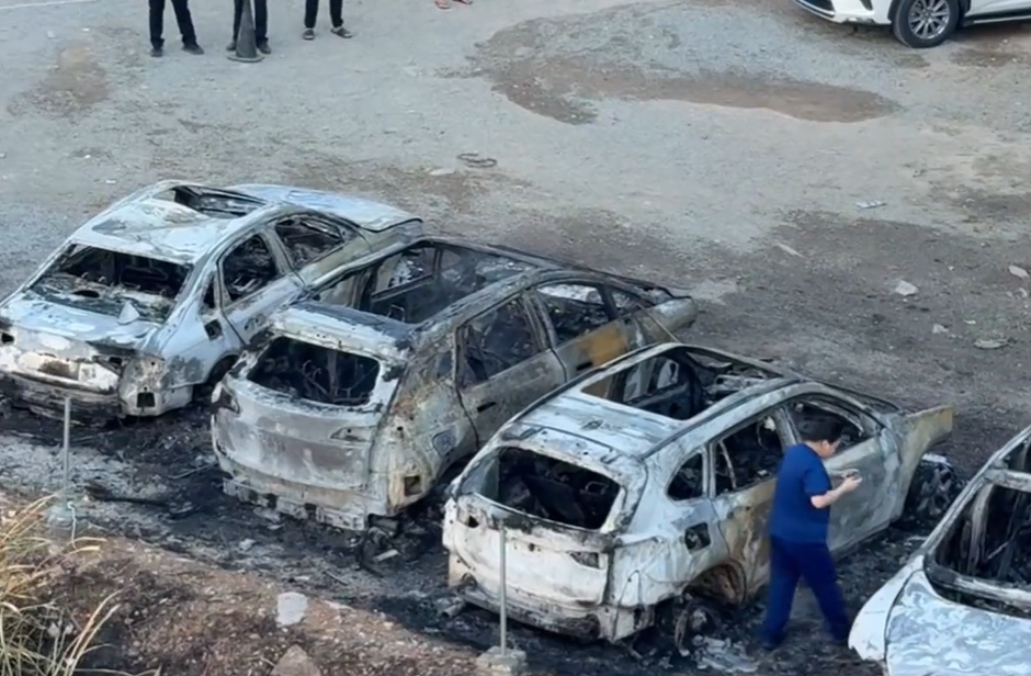 由于火势凶猛,除了与起火电动车并排停放的4辆车被烧成空壳外,对面停放的三辆车也一同遭殃,车身被大面积烧毁。