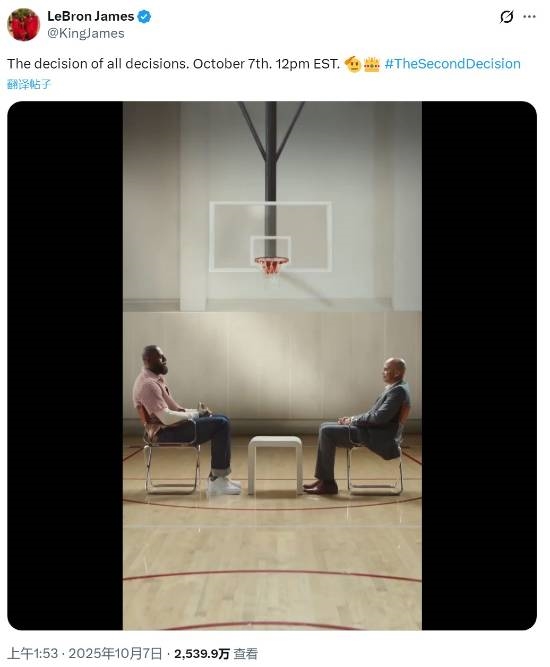 2025年10月7日,洛杉矶湖人队超级球星勒布朗·詹姆斯通过社交媒体发布了一条名为“第二次决定”的短视频,他将于北京时间2025年10月8日凌晨0点(美东时间10月7日中午12点)通过社交媒体宣布一项重大决定。