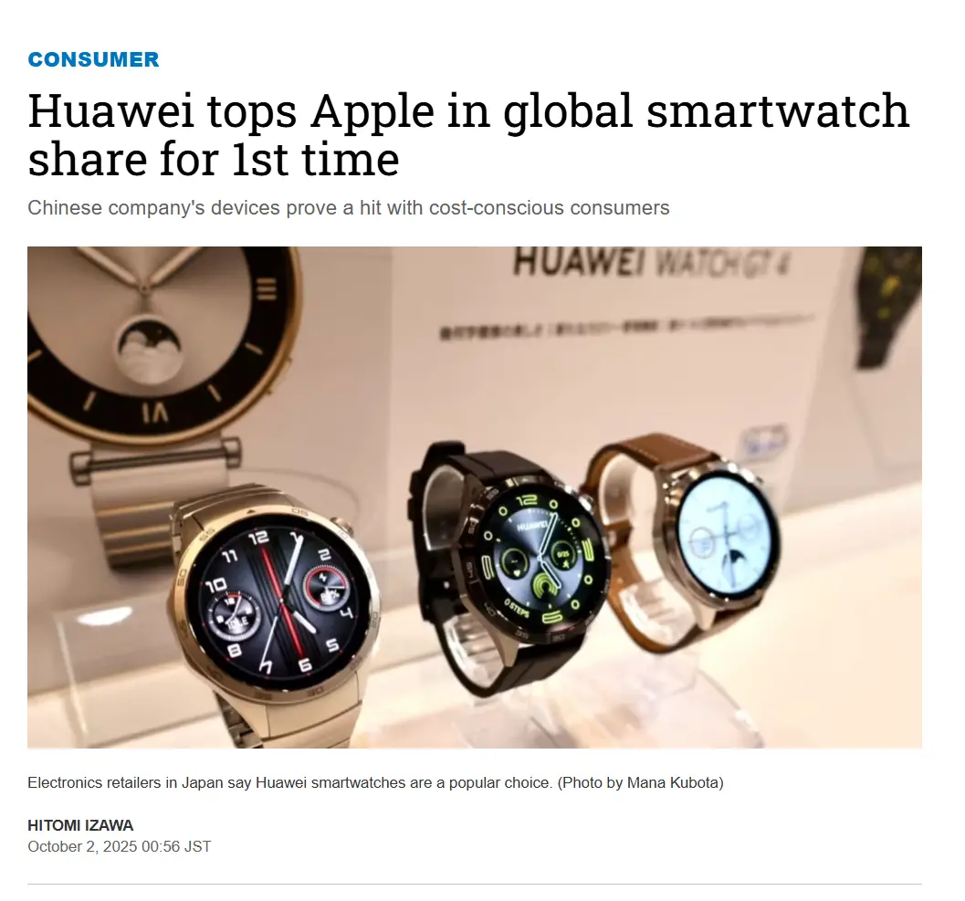 10 月 1 号,日本经济新闻炸出了一条猛料:华为手表出货量,首次干掉苹果,直接登顶全球智能手表市场第一。要知道,过去七年这个王座都是苹果牢牢占据,几乎没人敢想它会掉下去。