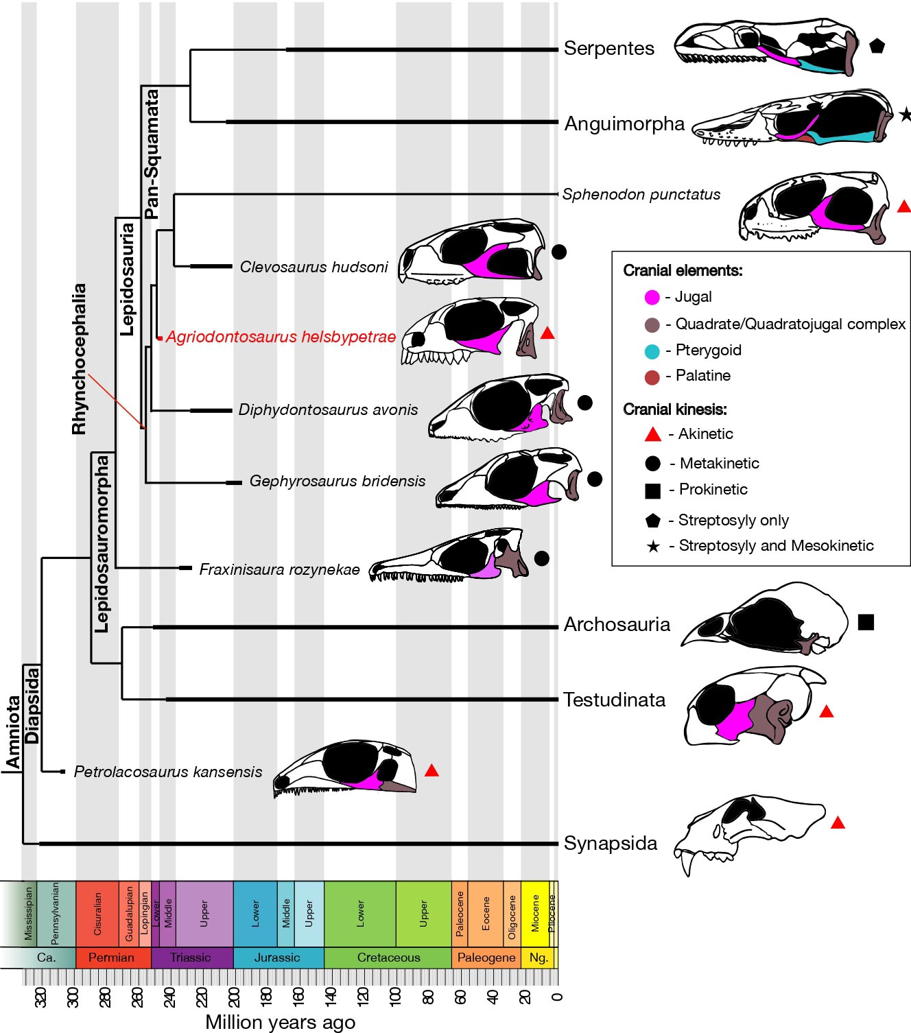 古生物学家长期以来一直认为,最早的地蜥形类应当已经具备典型的蜥蜴特征,如部分柔性的头骨、开放的下颞骨板,以及口腔顶部(腭部)具大量牙齿。在现代蜥蜴和蛇中,这些特征有助于嘴部大幅度张开以吞咽大型猎物,而腭齿则有助于控制较小、挣扎的动物。