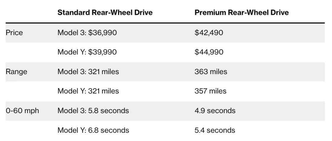 新款车型被称为“标准版”(Standard)。“标准版”Model Y和Model 3的续航里程均为321英里(约合516公里),加速性能也弱于名为Premium的高配版本。
