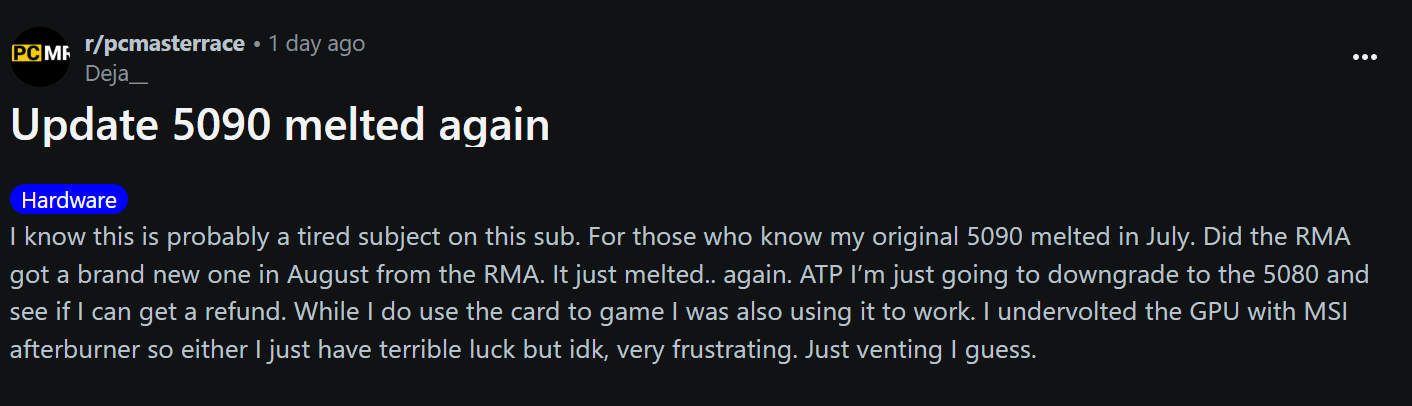 Deja表示,他已经累了,准备降级到RTX 5080,看看能不能争取一些退款,工作肯定会受一些影响但也没办法了。