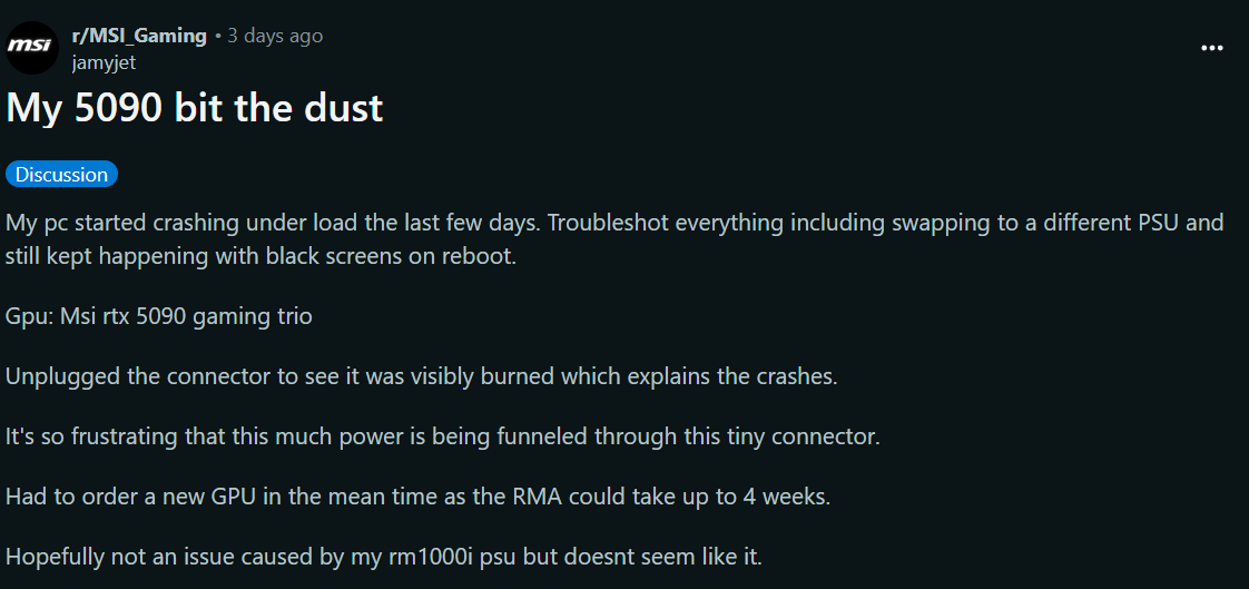 另一位网友“Jamyjet”也报告了一起RTX 5090供电接口烧毁事件,是微星的RTX 5090 GAMING TRIO。