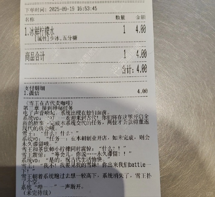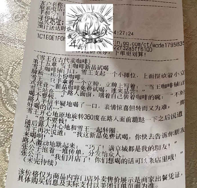 据悉,该连载小说名为《雪王在古代卖咖啡》,共20章,自9月起章节随机印在蜜雪冰城全国门店的小票上,顾客凭购物小票即可收集。