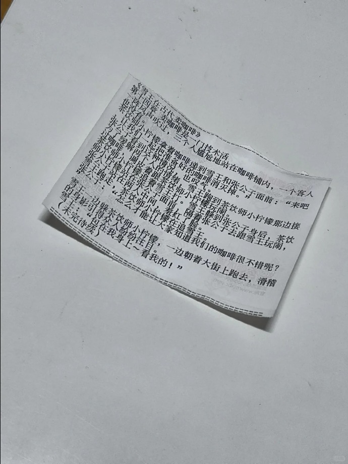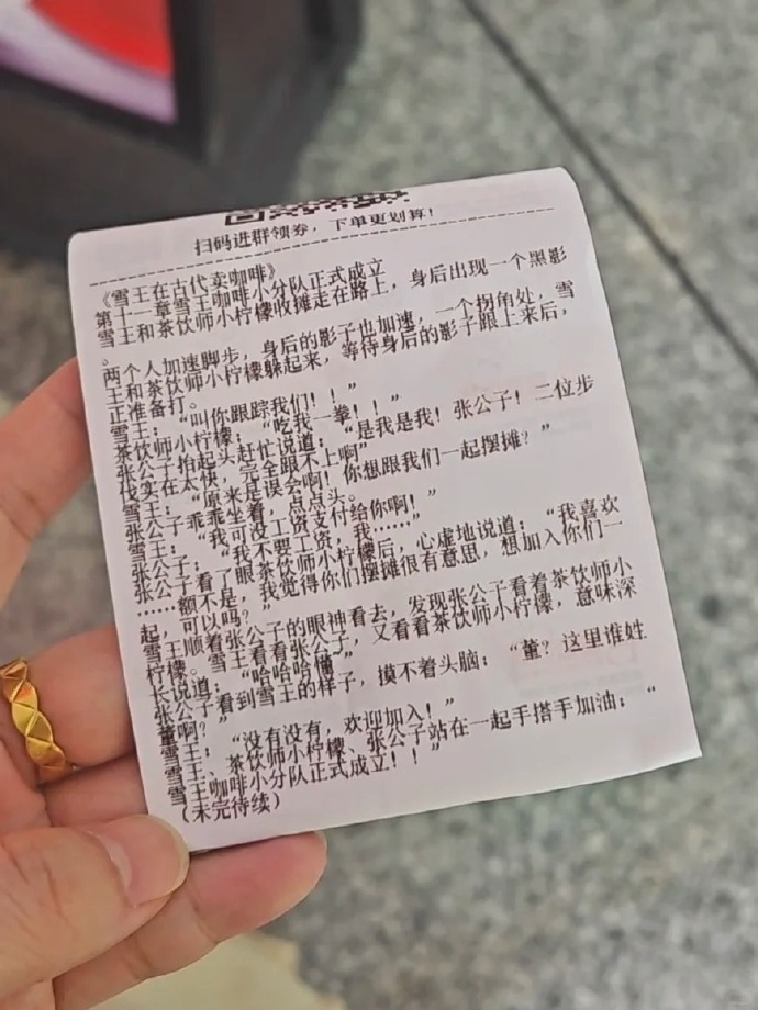 近日,不少网友表示,在购买蜜雪冰城后,发现店家的小票上印有小说。于是,评论区成了“章节交换站”,不少网友晒出自己拍到的其他章节。