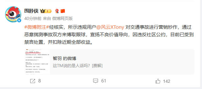对此,围脖侠发文称,经核实,用户@风云XTony 对交通事故进行营销炒作,通过恶意揣测事故双方来博取眼球,宣扬不良价值导向,因违反社区公约,目前已受到禁言处置,并扣除近期全部收益。