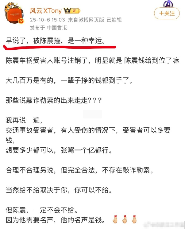 他表示:“大家都知道陈震有钱,又没买保险,又是名人,可以往死里要钱了,这里的钱不仅是法律上应该给的,还有道义上应该给的,比如法律上应该赔偿200万,到时候可以直接要他400万。”