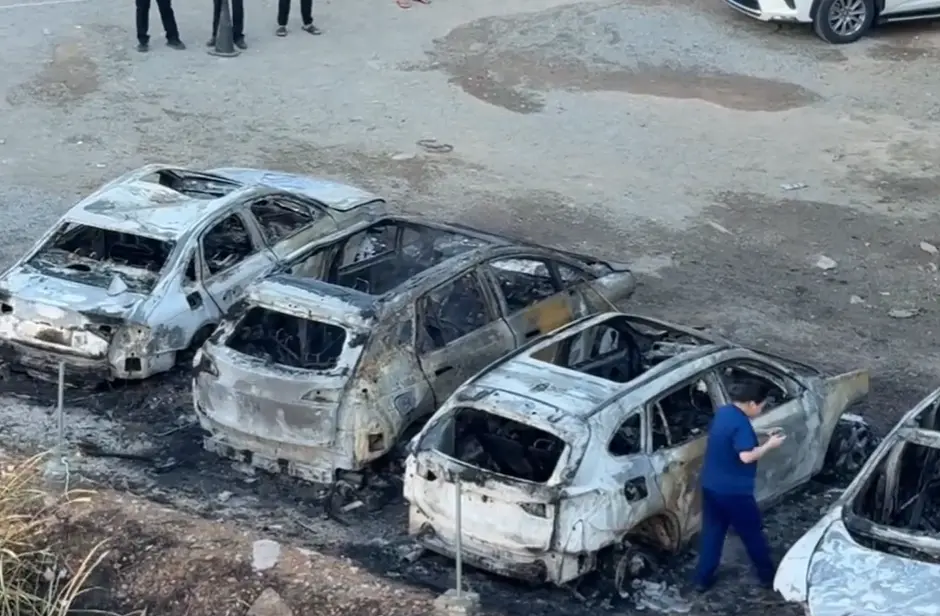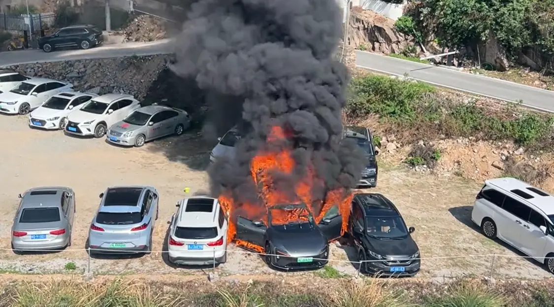 据媒体此前报道,10月5日,福建省宁德市三沙镇东壁村,一停车场出现连环火灾烧车事故。一辆阿维塔06突然自燃起火,明火很快就将两侧的车辆引燃,由于火势凶猛,除了与起火电动车并排停放的四辆车被烧成空壳外,对面停放的三辆车也一同遭殃,车身被大面积烧毁。