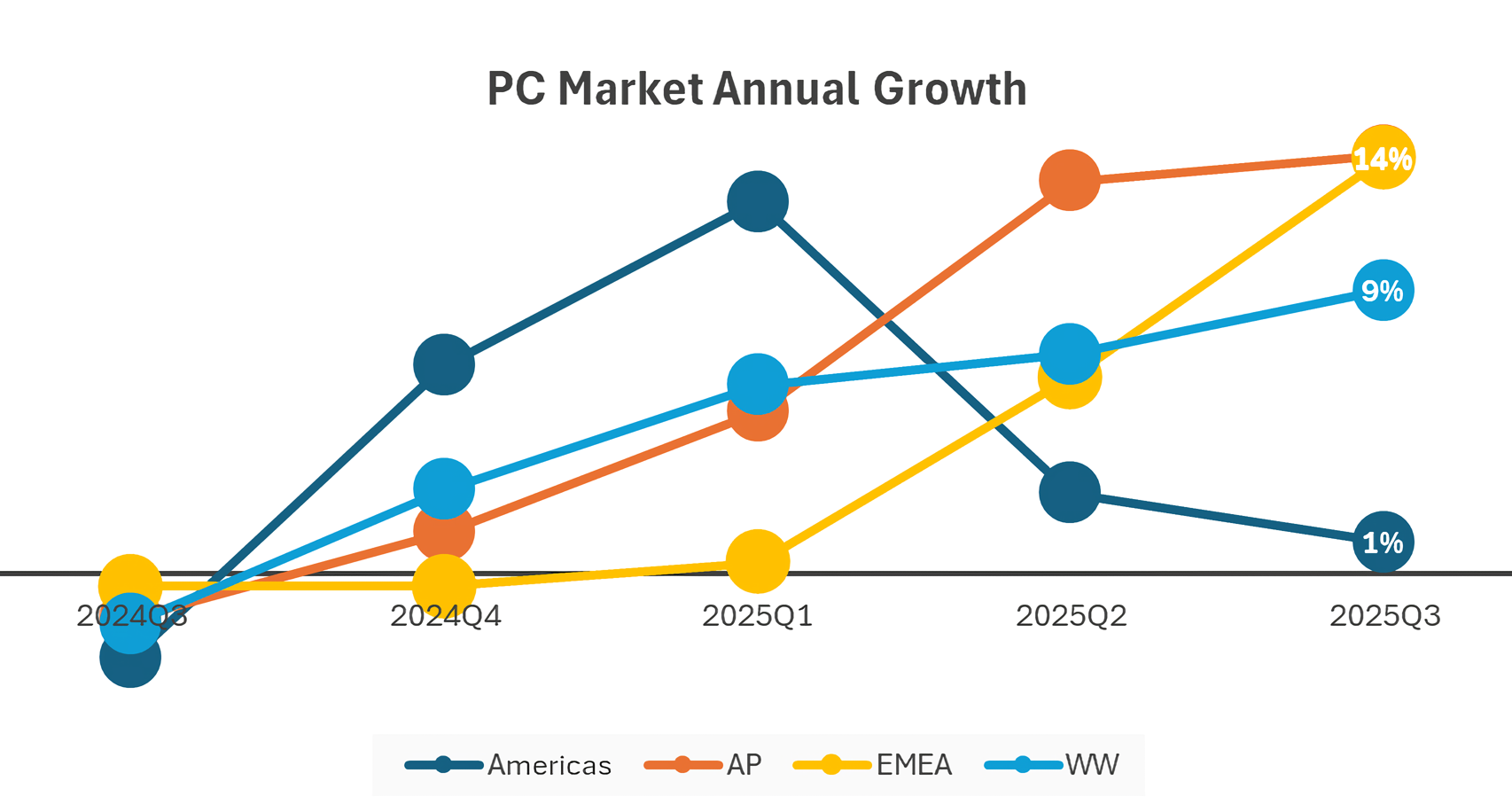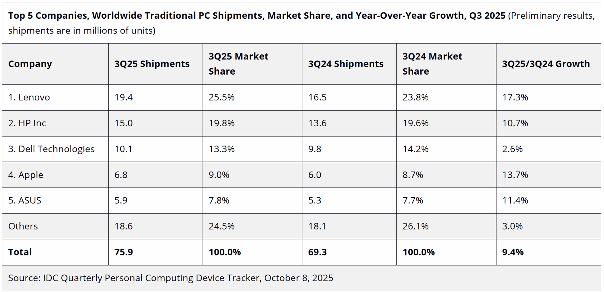 据知名市场调研机构IDC最新报告显示,2025年第三季度全球个人电脑(PC)出货量同比增长9.4%,达到7580万台,令众多厂商欢欣鼓舞。其中,中国与日本贡献突出,成为亚太地区增长的最大动力;相比之下,北美市场受到美国进口关税影响,面临显著的经济压力和不确定性。