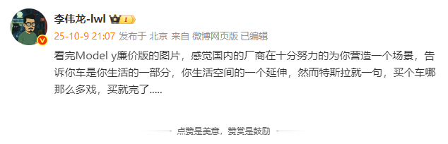 近日,汽车博主“李伟龙-lwl”发布微博,锐评了一番廉价Model Y,他表示: