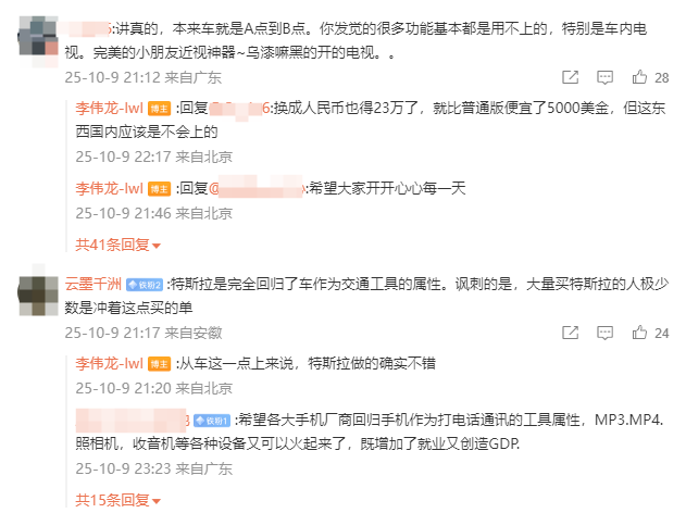 不过也有特斯拉粉丝对国内新能源不屑一顾,在博主这条微博的评论区就有人留言道:讲真的,本来车就是A点到B点,你发觉的很多功能基本都是用不上的,特别是车内电视,完美的小朋友近视神器,乌漆嘛黑的开的电视。