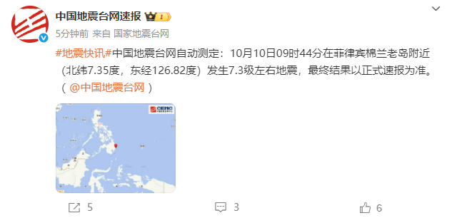 据“中国地震台网速报”:10月10日09时44分在菲律宾棉兰老岛附近(北纬7.35度,东经126.82度)发生7.3级左右地震,最终结果以正式速报为准。